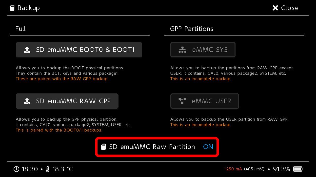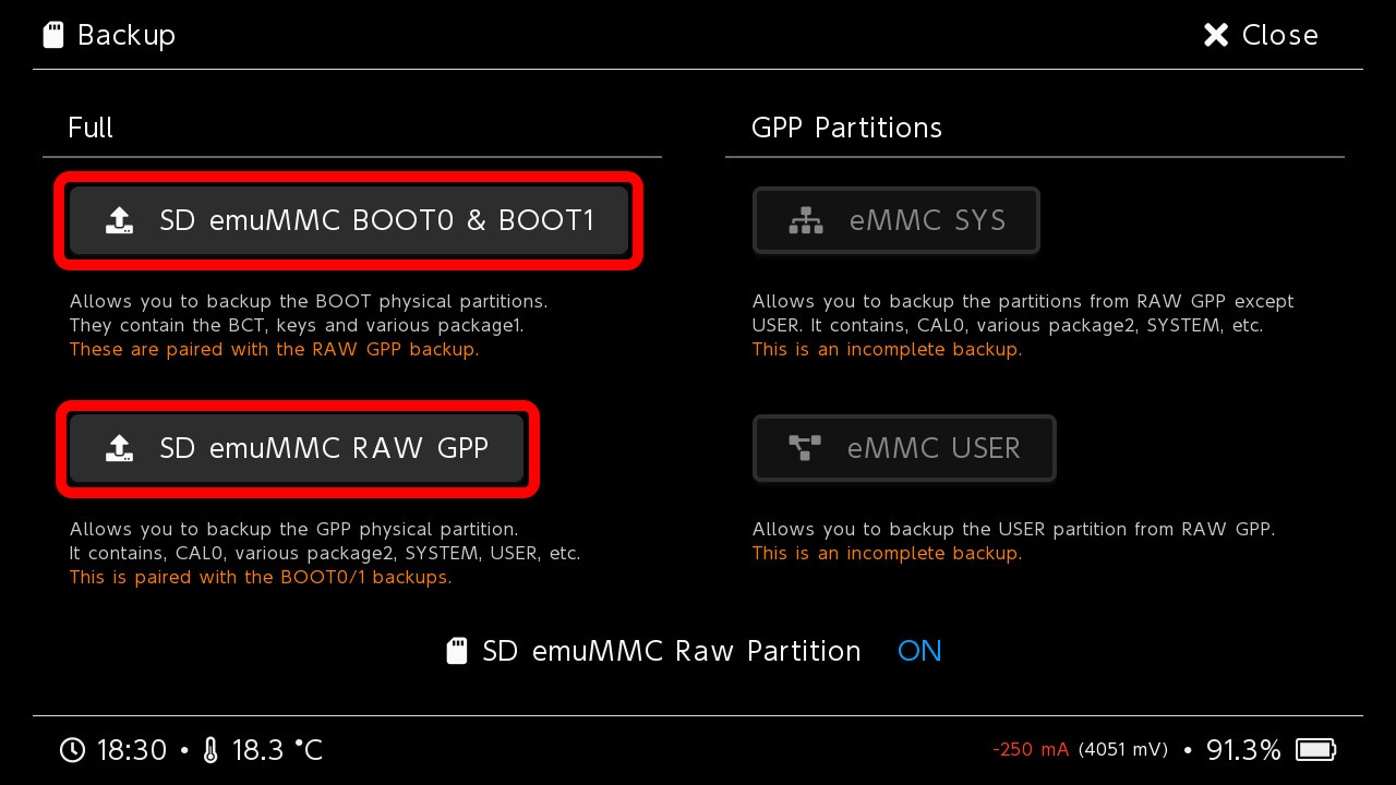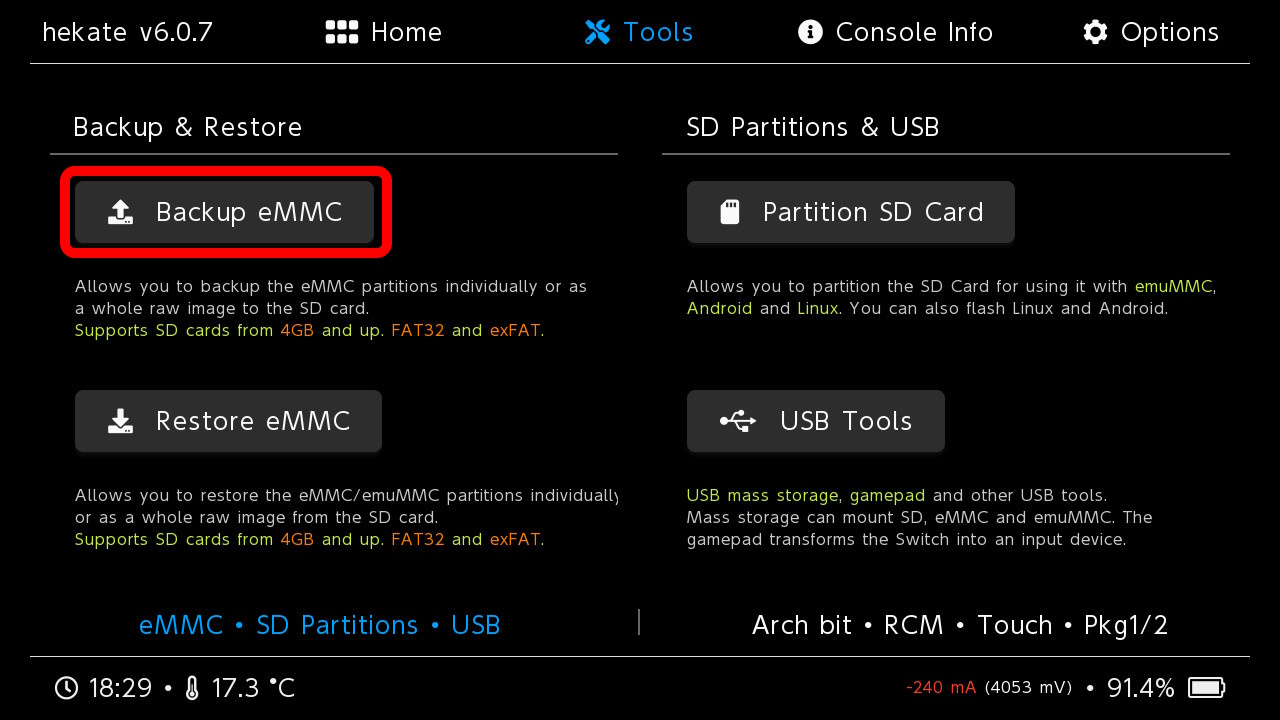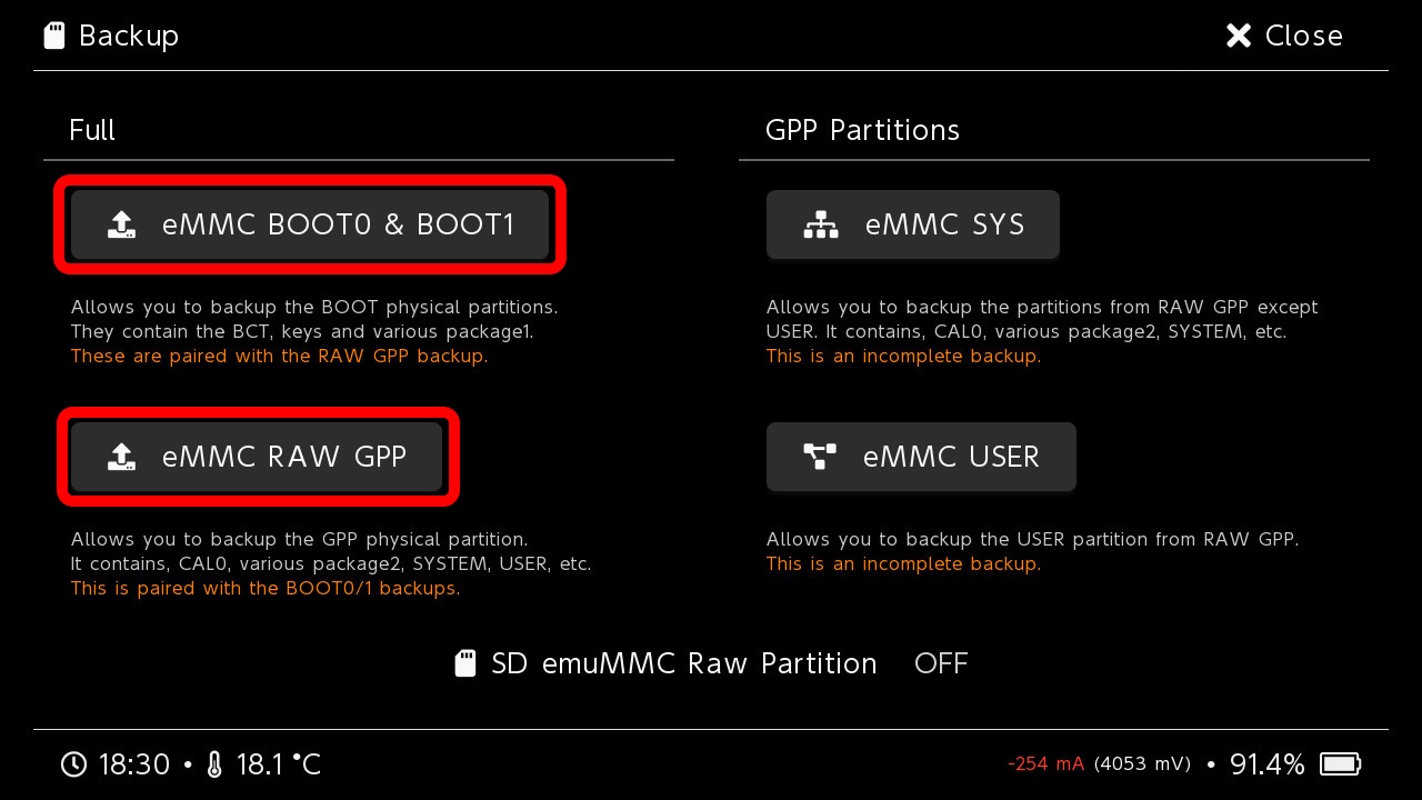- Убедитесь, что на карте памяти есть свободное место для бэкапа. Требуемое место зависит от размера Эмунанда, если вы не редактировали размер при создании, то для v1/v2/lite - 32gb, для oled - 64gb.