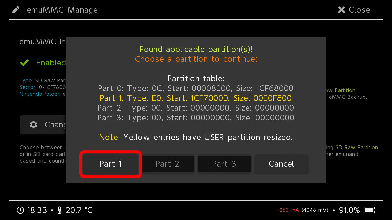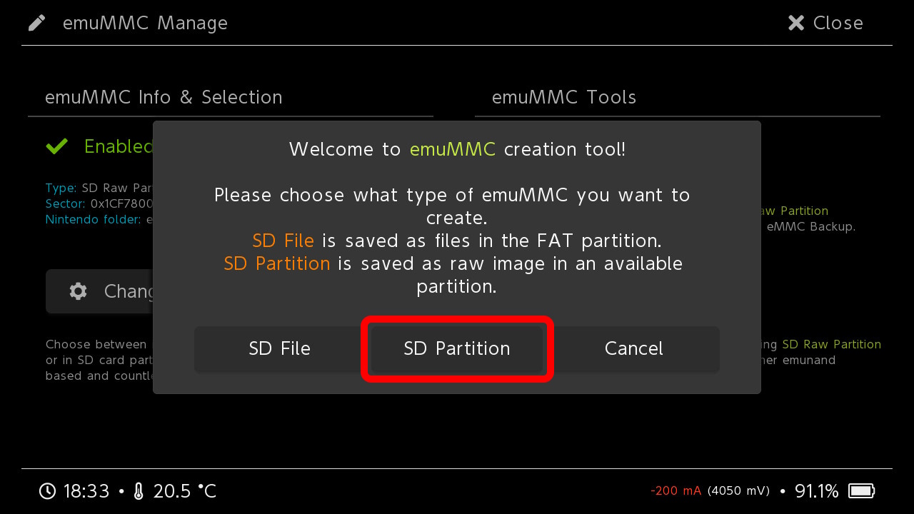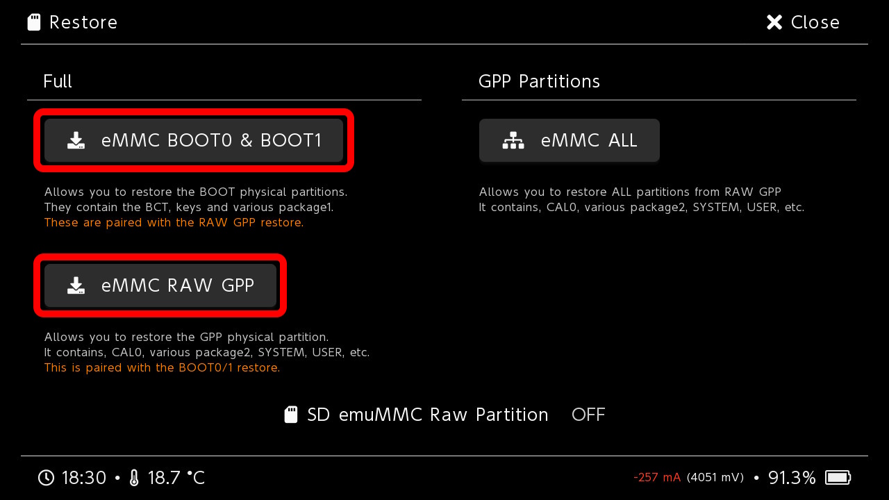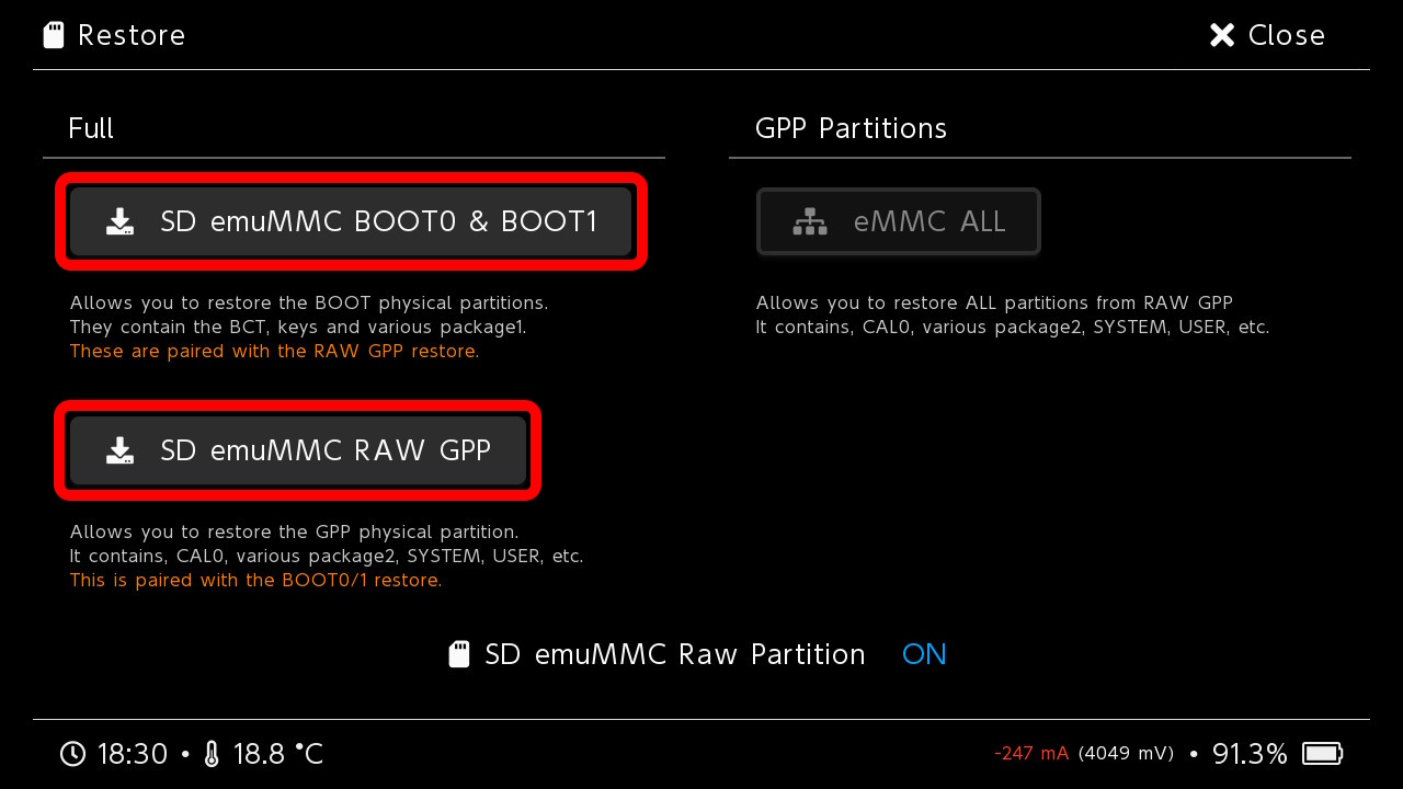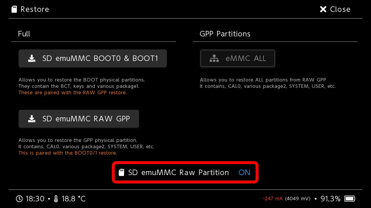 - Переключаем слот восстановления на эмунанд нажав на пункт SD emuMMC Raw Partition.