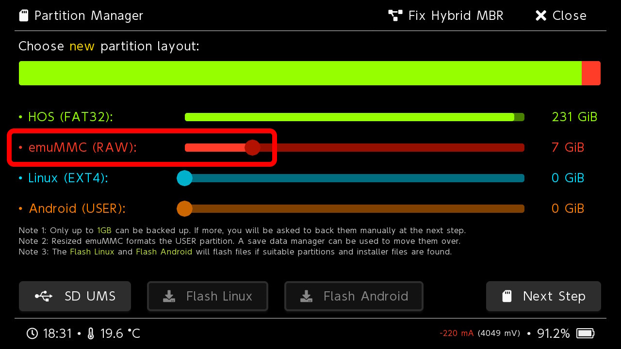 - Ползунком emuMMC (RAW) выбираем желаемый размер будущего Эмунанда.