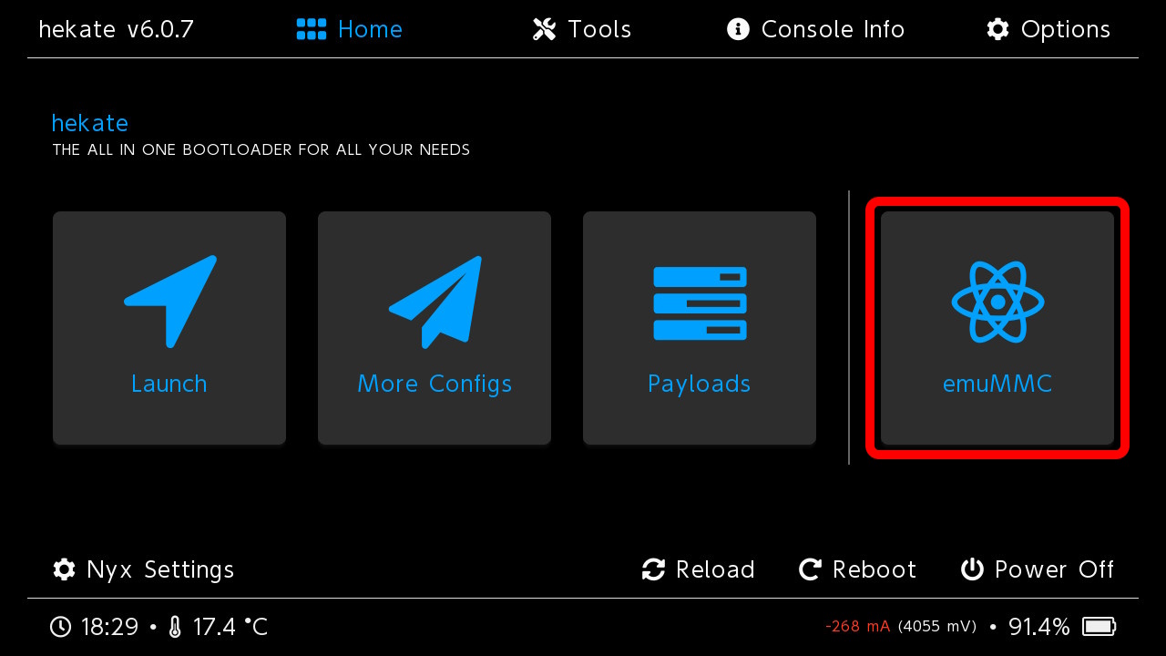 - После успешного форматирования карты памяти, выходим обратно на главное меню Hekate - на вкладку Home, после чего заходим в пункт emuMMC.