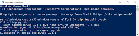 pip install pyusbи ждем завершения установки, затем закрываем.