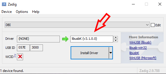 В окне Zadig определится устройство DBI, необходимо выбрать драйвер